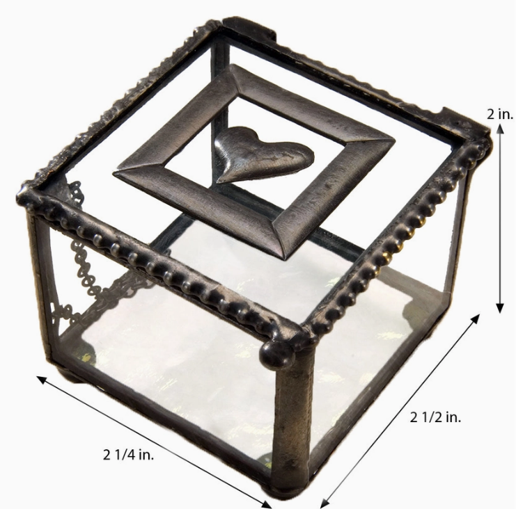 This Tiffany styled keepsake box features a hammered metal heart with beaded edging on the top and a clear iridescent glass in the bottom that shimmers with a rainbow of colors. Adding to its delicate function a small chain on the inside holds the hinged lid in place and round ball feet make sure that the light shines in on all sides.