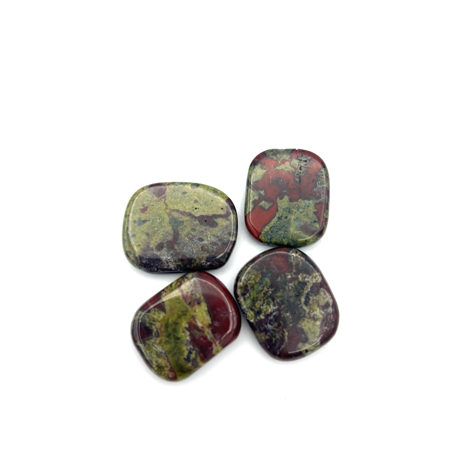 Dragon Bloodstone Smooth Palm Stone are approx. 20x25mm and sold individually. Due to the unique nature of natural stones, the exact color, shape and size may vary.
