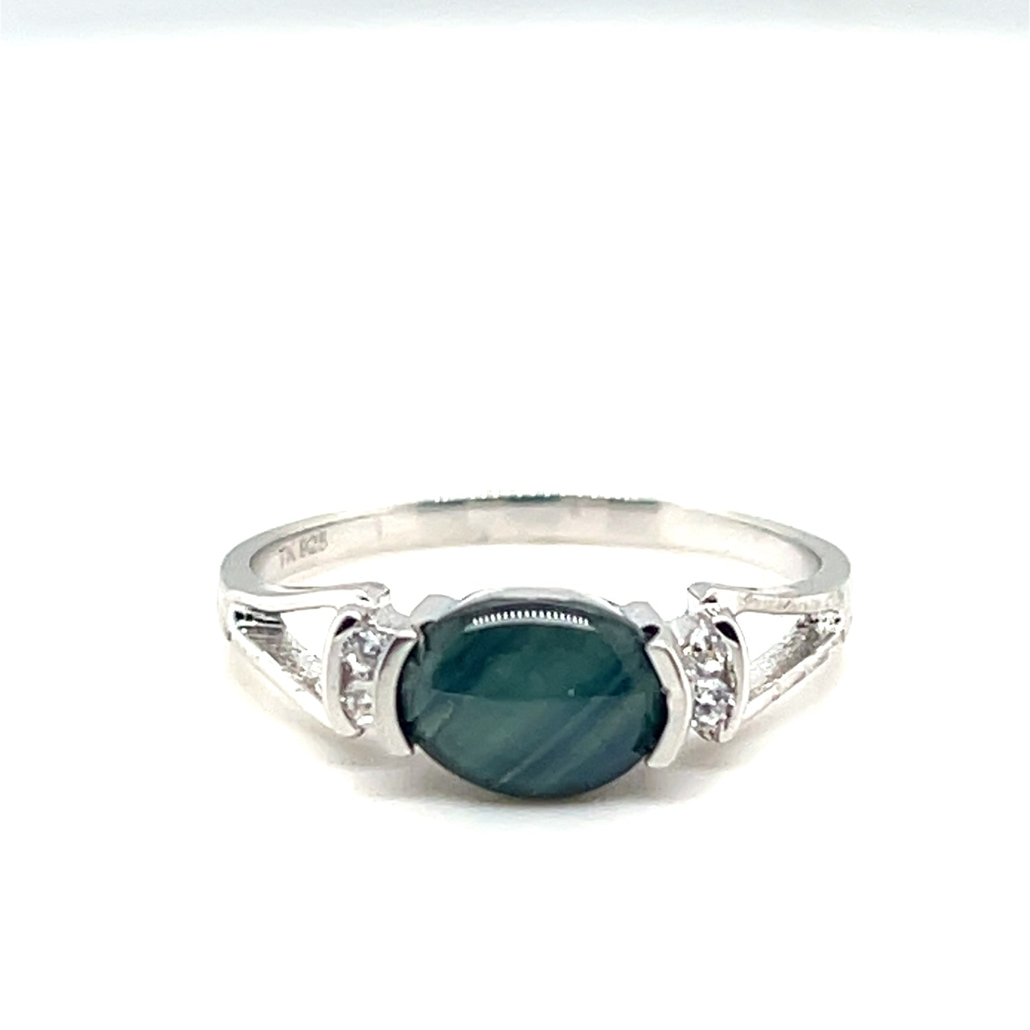 Beautiful Blue Star Sapphire Ring with White Topaz accent stones and set in Sterling Silver.